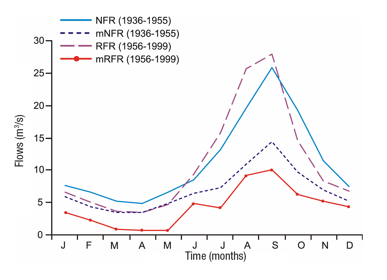 Hydrologic regime (natural and regulated). Daily flow records were obtained from the hydrometric station (12310) (BANDAS, 2006). We identified two periods: The first period extends from 1936 to 1955 and is named the natural flow regime (NFR); the second period from 1956 to 1999 corresponds to the regulated flow regime (RFR). Figure 2 shows the variation in river flow before and after the hydraulic regulation in the indicated periods. The total annual difference between average mon thly flows of the NFR and RFR is less than 10%, whereas the minimum regulated flow regimes (mRFR) show a decrease of 43% relative to the minimum natural flow regimes (mNFR).