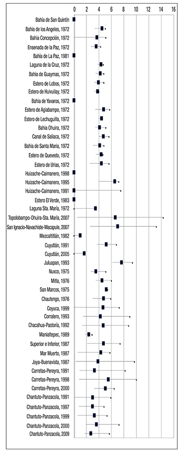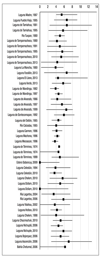 En la Tabla 3, donde se muestra la integración de los mismos pa rámetros para el golfo de México-Caribe mexicano, contrasta la mayor frecuencia de análisis, e incluso por el mismo grupo de investigadores y algunos otros autores extranjeros.