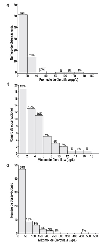 El contenido de clorofila a en los ecosistemas costeros es un índice que da idea de las condiciones tróficas naturales o culturales (Vázquez Botello et al., 2006). Se caracteriza por su amplia variación temporal (fundamentalmente diurna) como espacial (distribución en parches). Bajo condiciones de no impacto por actividades antropogénicas, se han registrado desde <1mg/m3 hasta poco más de 143 mg/m3,como en Chantuto-Panzacola en 1991, siendo ejemplo de un caso extremo; sin embargo, 25 años después (2015) se determinaron contenidos de 43 mg/m3, disminución que puede ser resultado de la distribución en parches del fitoplancton. Con base en la información recopilada, los in tervalos de las concentraciones de este pigmento pueden oscilar entre < 4 a 20mg/m3 (Tablas 2 y 3; Figuras 9-10), Figuraue representan entre 27% a 50%, respectivamente. Aunque este amplio intervalo también varía localmente; por ejemplo, la laguna La Cruz (Sonora) registró valores de clorofila a de 3.89 en verano y de 4.79mg/m3 en invierno (Morales-Soto et al., 2000).